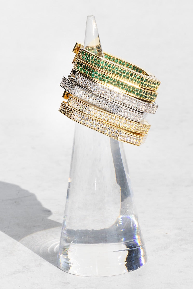 Sharp lines, strong angles—these octagonal hoops are made to stand out. Crafted in 14K gold plate and inlaid with emerald CZs for a refined edge, they’re ultra-light and effortless for everyday wear. A bold, modern statement that catches the light and commands attention. |