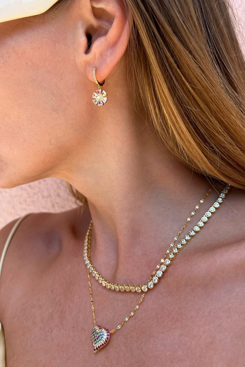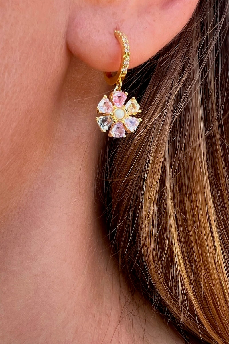 These stunning 14K gold vermeil huggie earrings feature a vibrant and colorful floral design with sparkling multi gemstones and cubic zirconia. Elevate any outfit with these unique and eye-catching earrings. Crafted with high-quality materials for a luxurious touch.