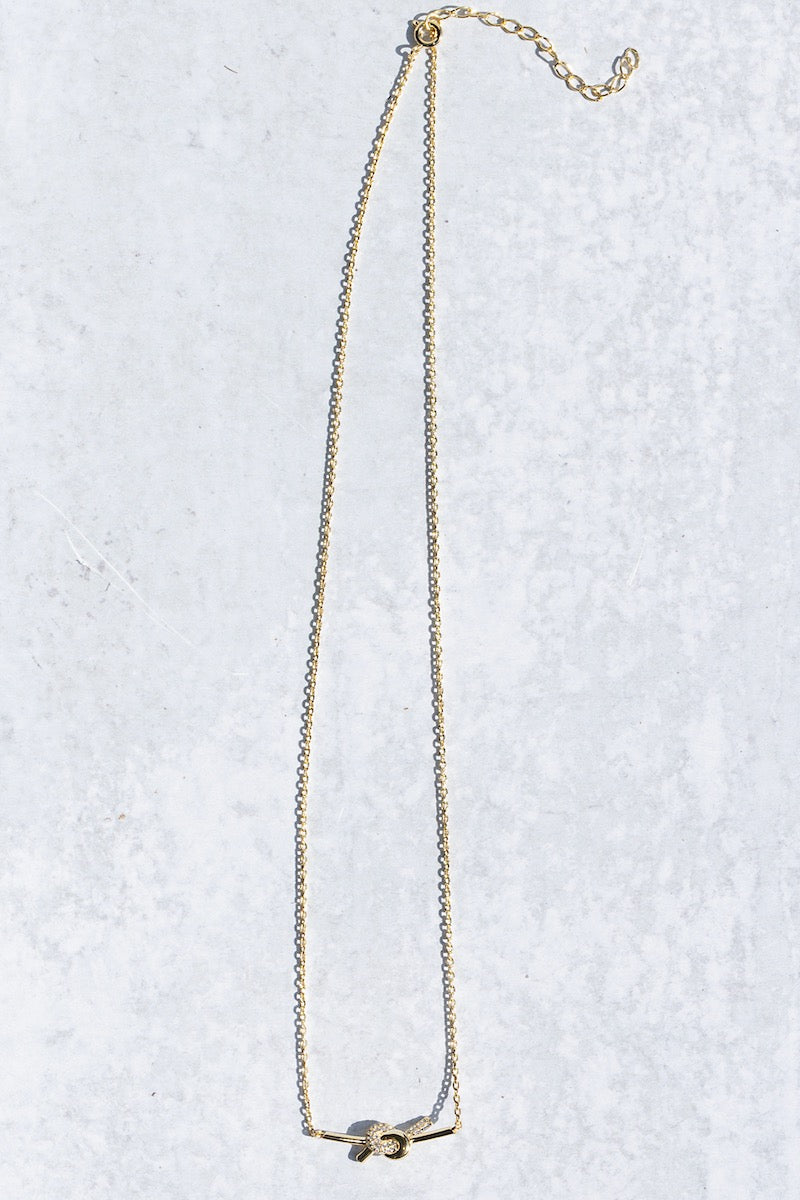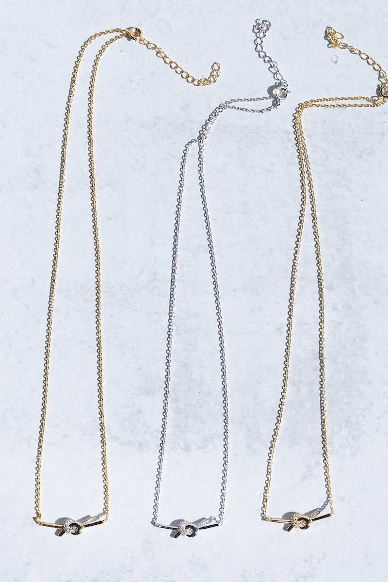 Crafted in14K gold vermeil, this necklace features a sculptural love knot—a timeless symbol of connection and intention. Suspended from a delicate chain, it’s a refined piece designed to sit close to the heart.