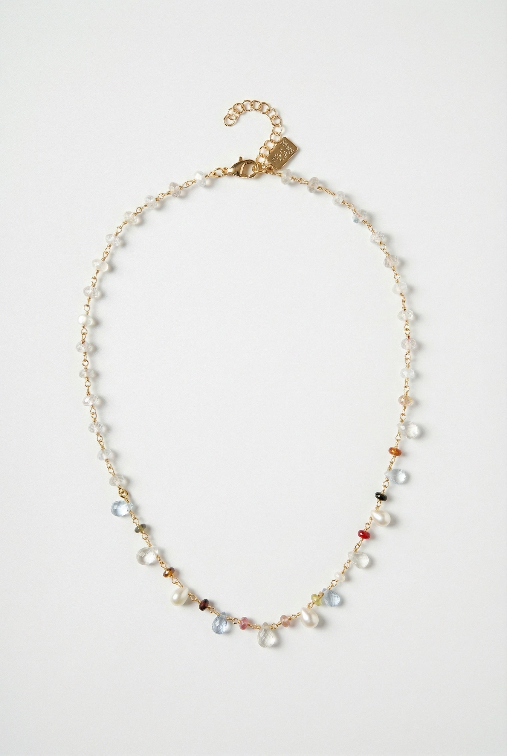 The necklace features a rose quartz, green onyx, opal, and aqua chalcedony gemstone chain with a multi-faceted clear coin and mixed teardrop design. Made with 14K gold vermeil, this 13" necklace comes with a 2 inch extender for the perfect fit. Elevate any outfit with this versatile and luxurious piece.