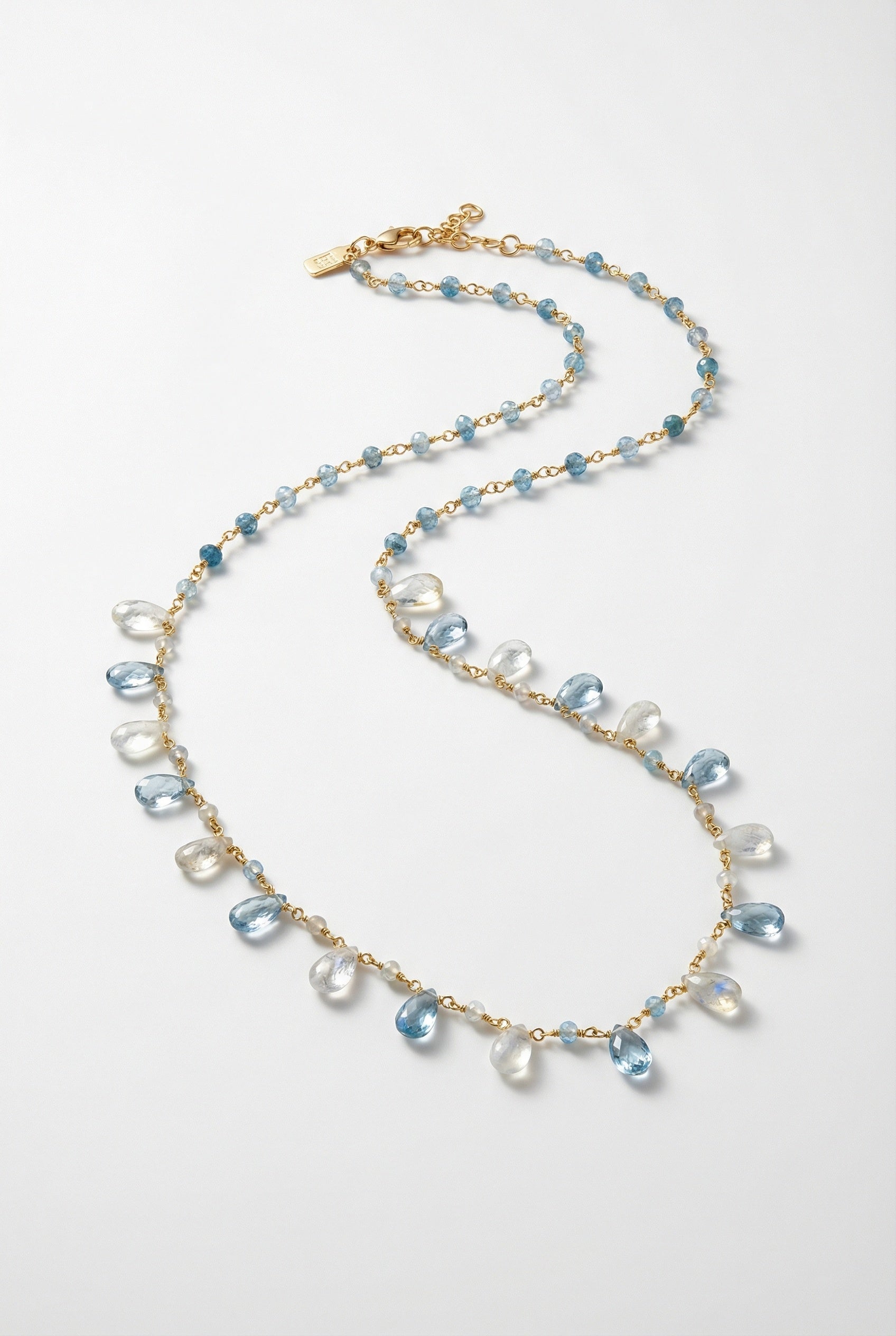 This 14K gold vermeil necklace boasts a multi-faceted clear coin, mixed with rainbow moonstone and aqua chalcedony teardrop gemstones. With a length of 26 inches and a 2-inch extender, this piece adds elegance and versatility to any outfit. Expertly crafted for a luxurious and timeless look.