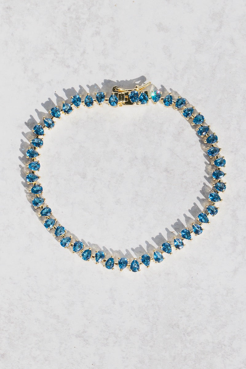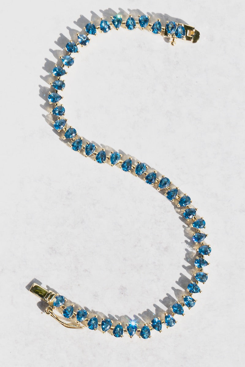 Radiant and refined, this 14K gold vermeil bracelet features a cascade of faceted teardrop London blue topaz CZs that shimmer with every movement. Measuring 6.5 inches, it adds the perfect pop of color — stunning worn solo or layered for an effortless touch of everyday glamour.