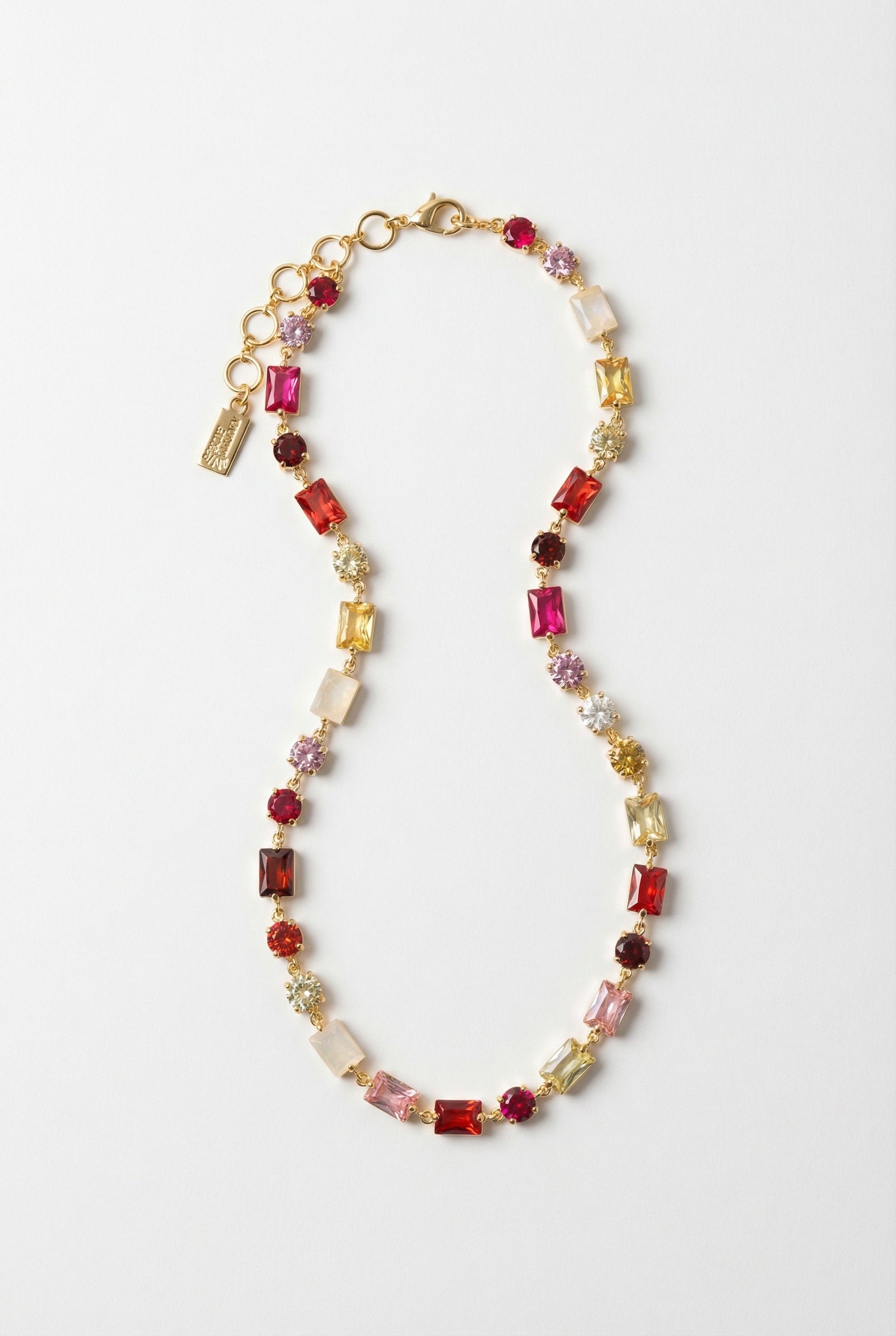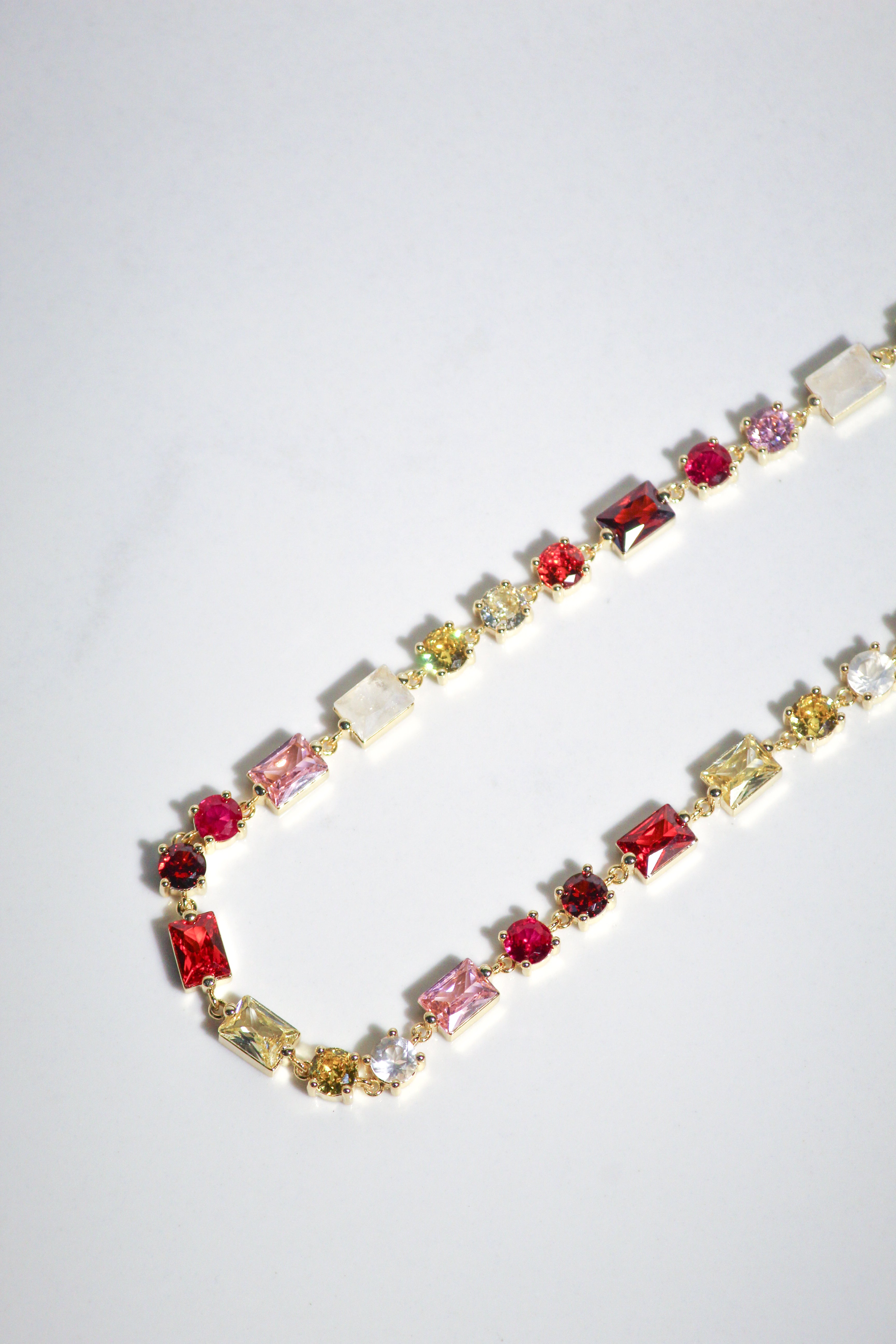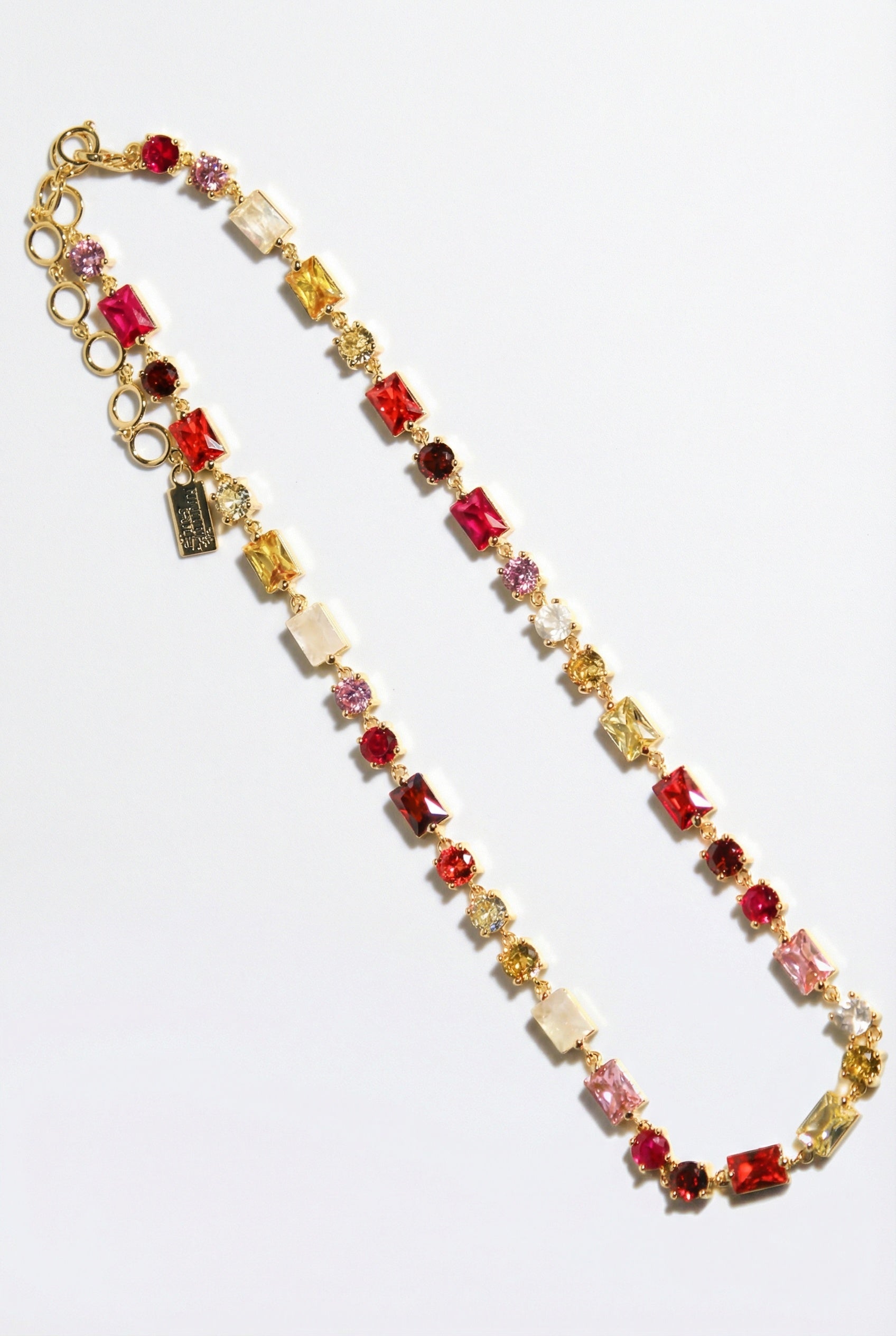 This necklace features a combination of 14K gold plate, red, pink and multi cz, and natural rainbow moonstone, creating a stunning and unique design. With an adjustable length of 16-18 inches, this necklace will add a touch of elegance to any outfit.