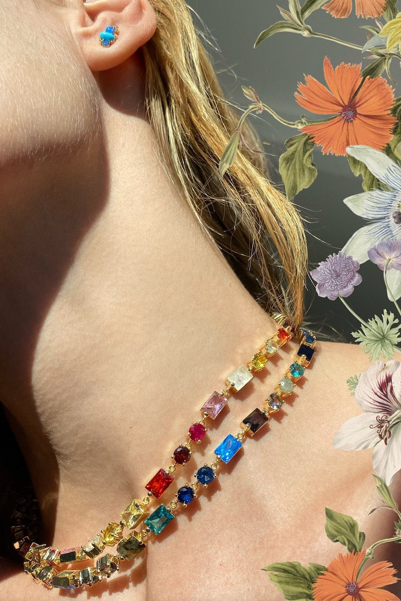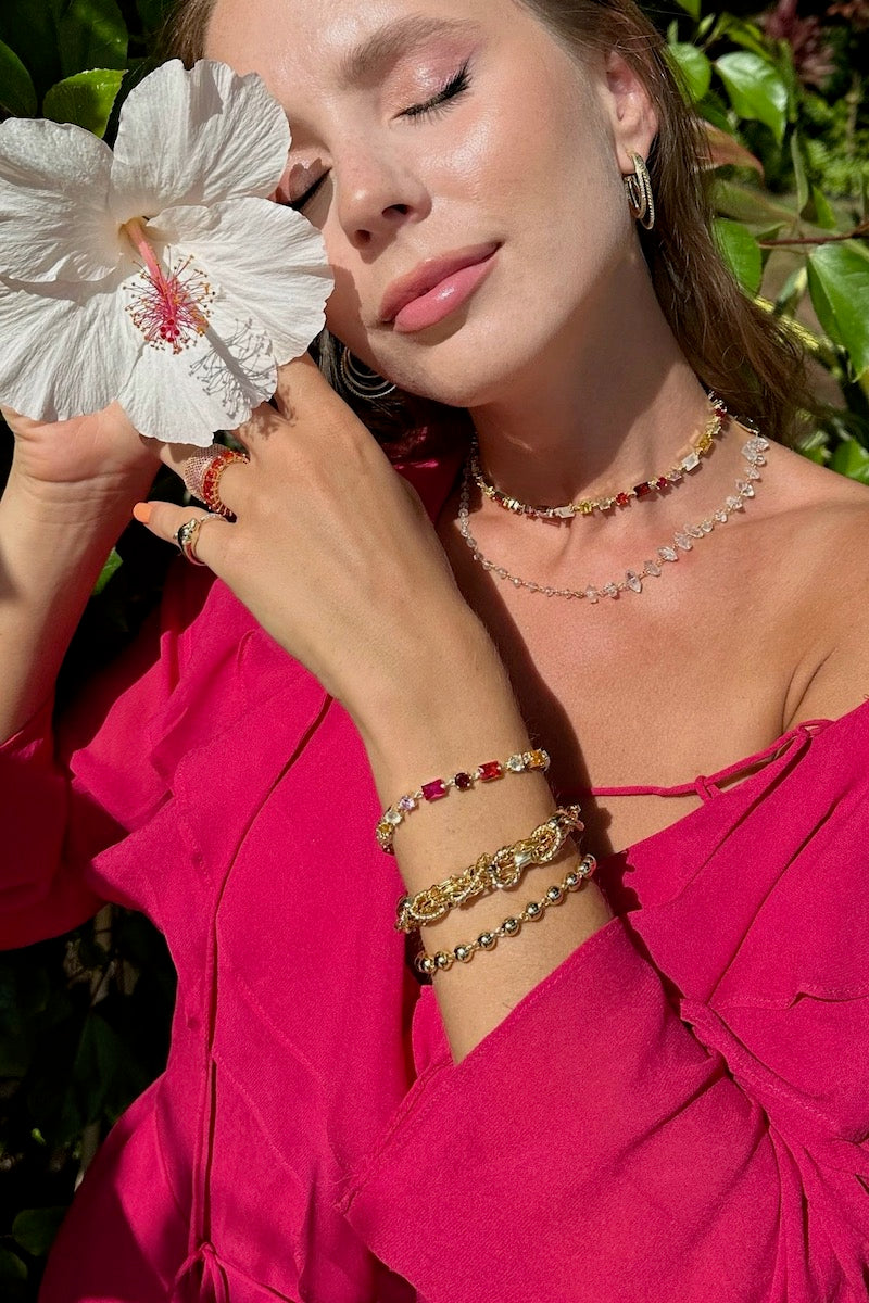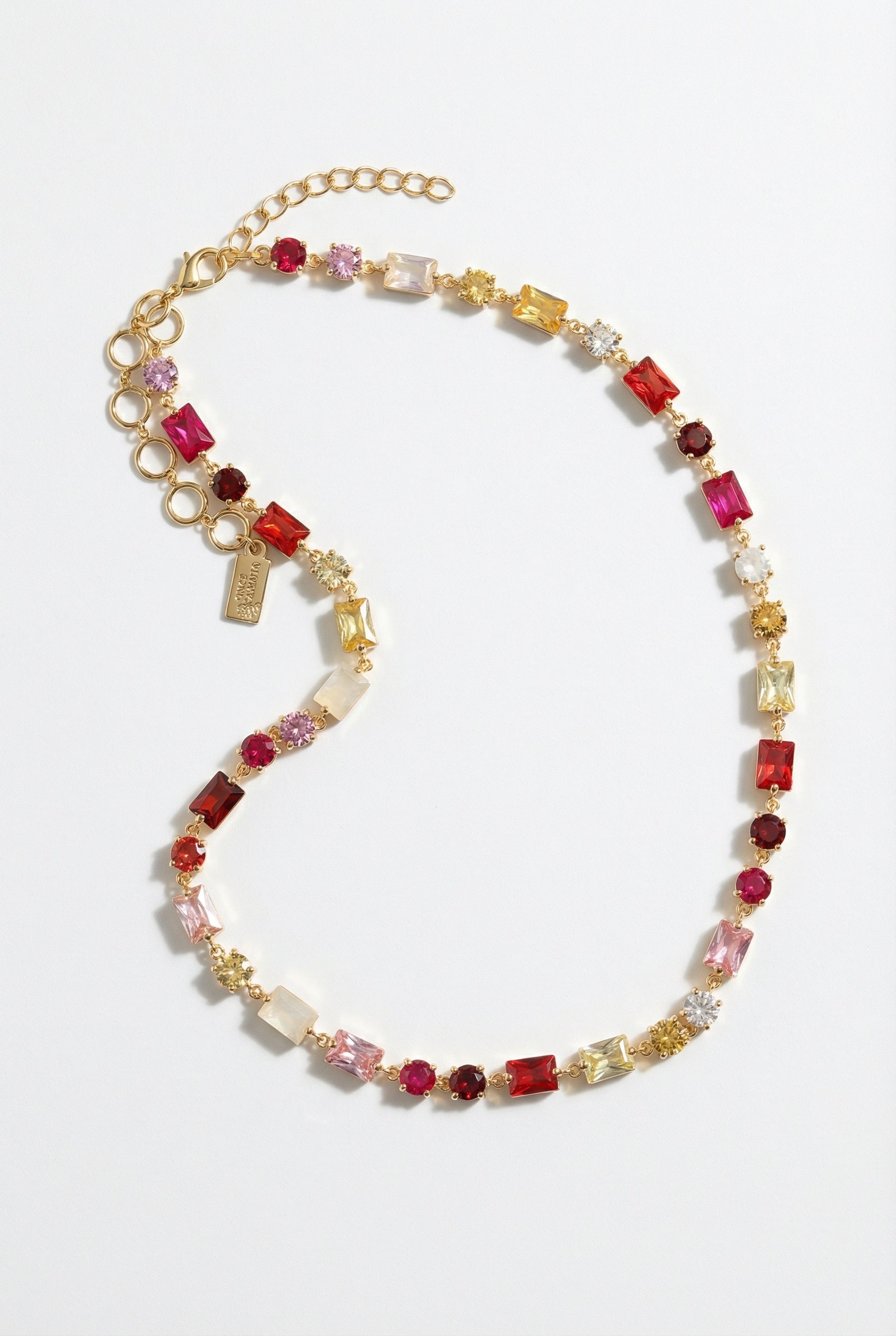 This necklace features a combination of 14K gold plate, red, pink and multi cz, and natural rainbow moonstone, creating a stunning and unique design. With an adjustable length of 16-18 inches, this necklace will add a touch of elegance to any outfit.