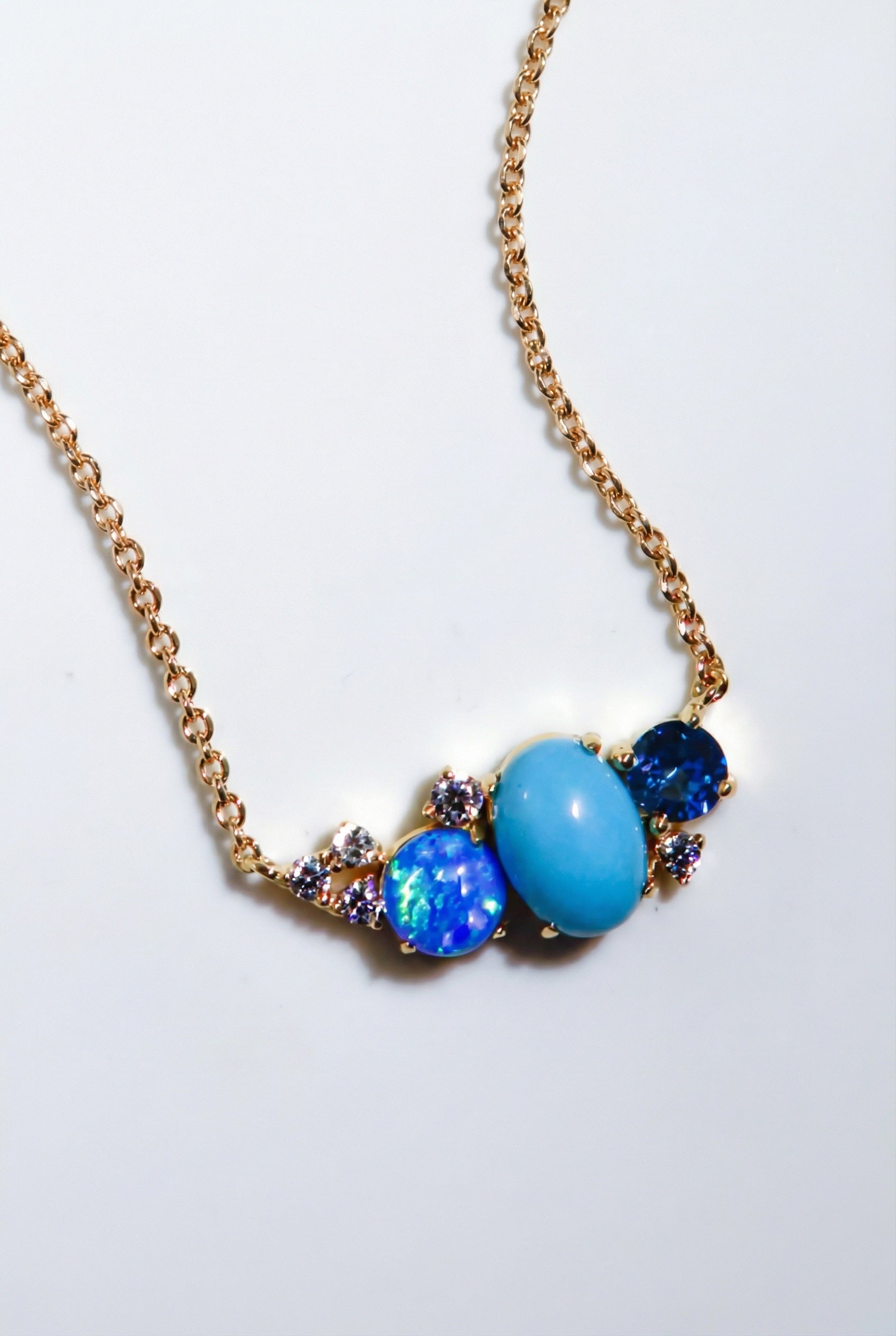 Crafted with 14K gold vermeil and adorned with stunning turquoise, teal opal and cz cluster, this necklace features an adjustable 16-18 inch length allows for a perfect fit, making it a versatile and luxurious addition to your jewelry collection.